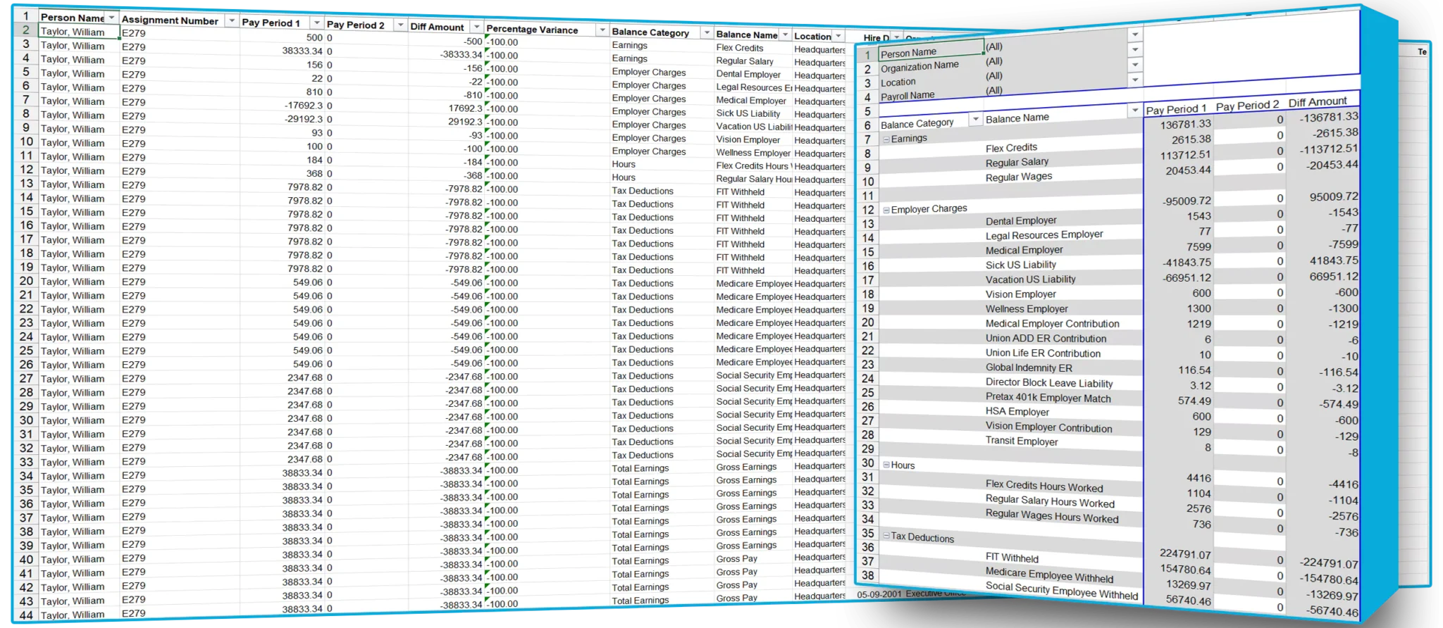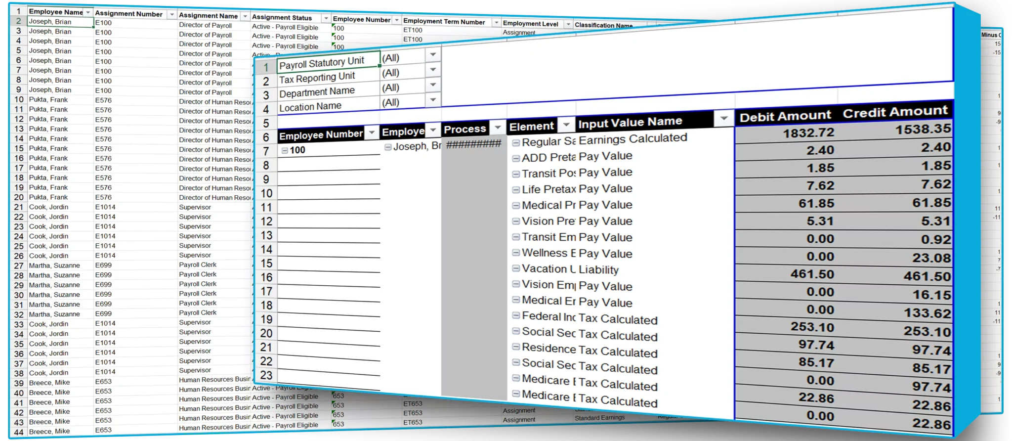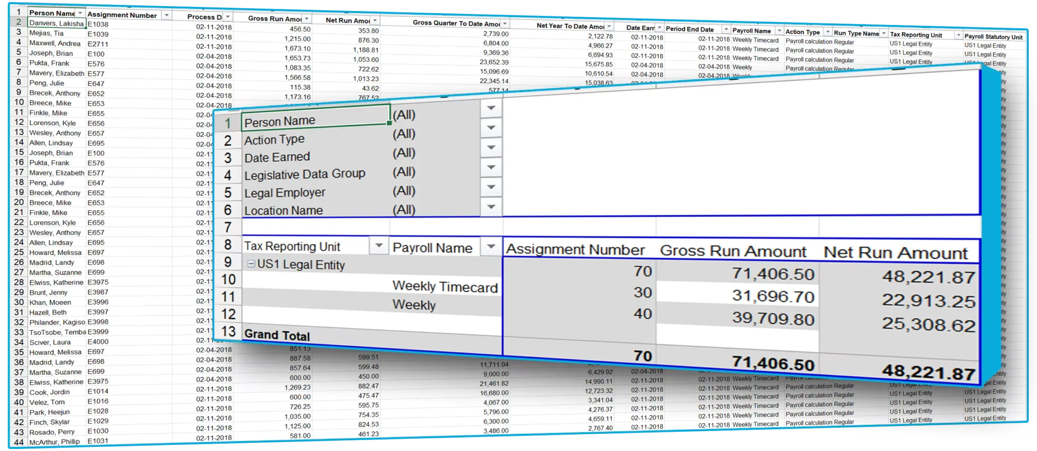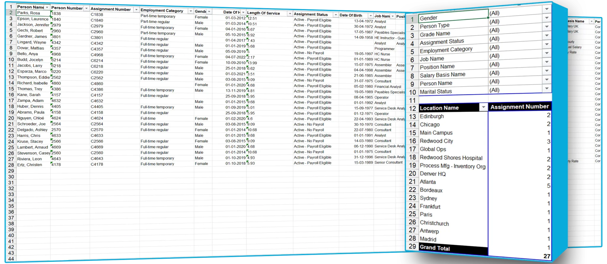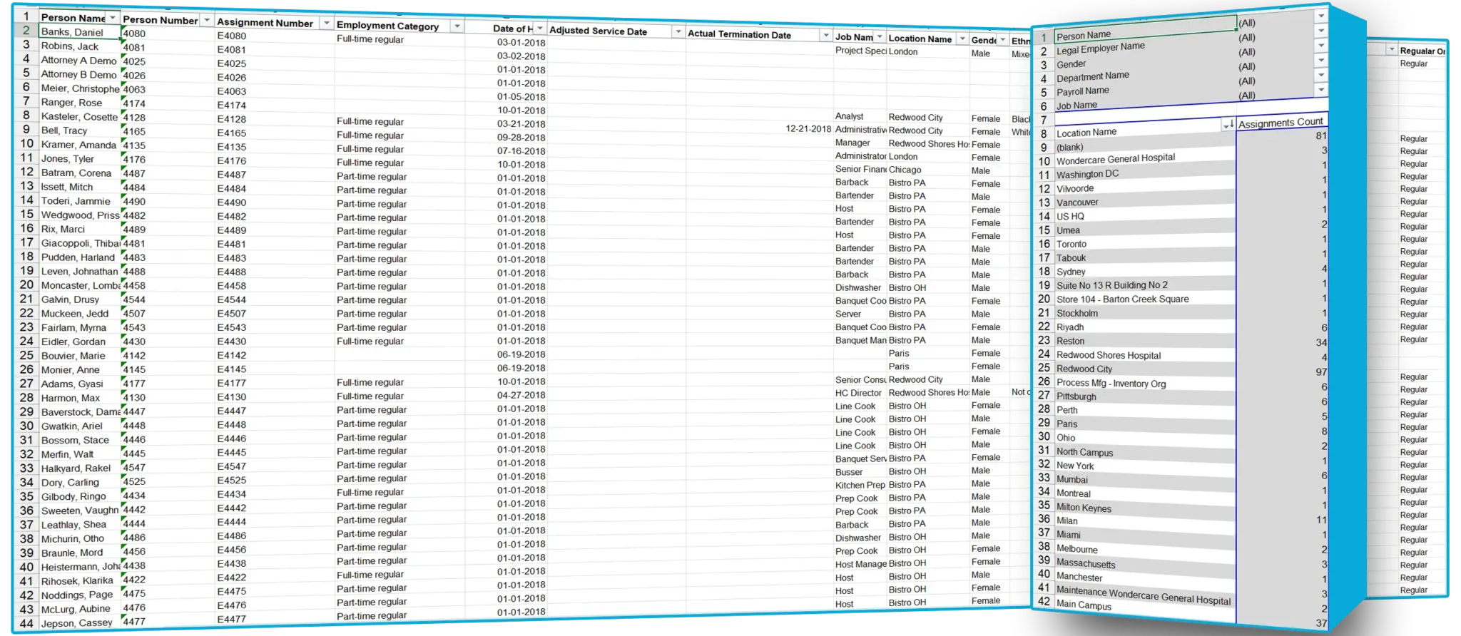 This report displays information about newly hired persons. The information is available in Person, Assignment, Department, Job, Position, Grade, Location windows of Fusion Human Resources module. A row is displayed for each newly hired person and displays information about person and assignments such as Department, Job, Position, Grade, Location, Payroll, Salary for all active employees along with other person information. For this report, access to data is dependent on HR roles the user has of Fusion Human Resources module.
