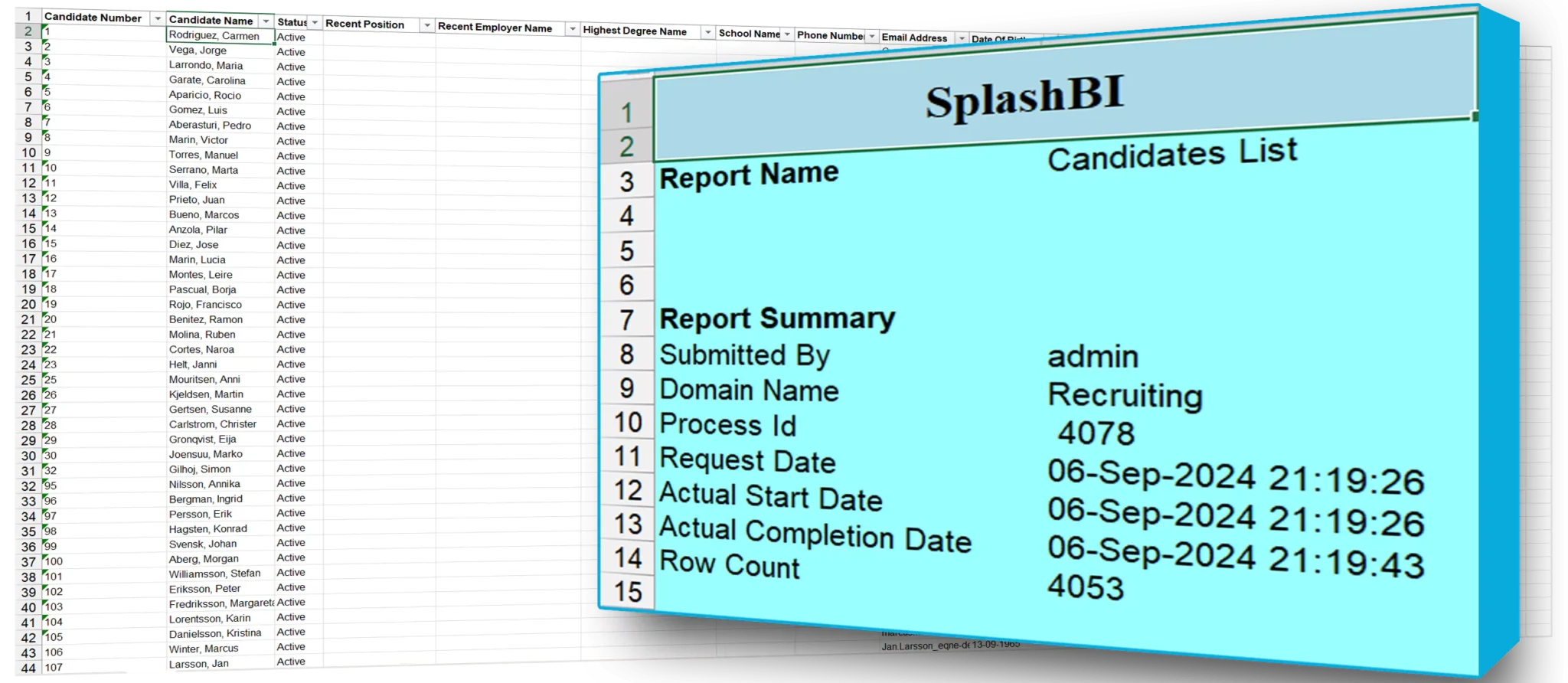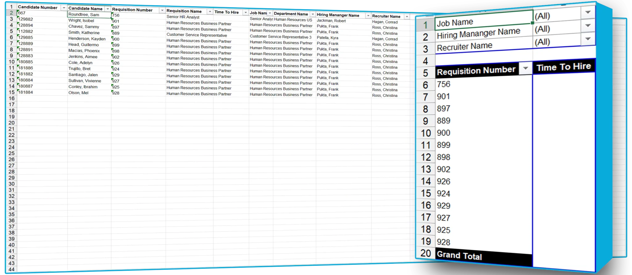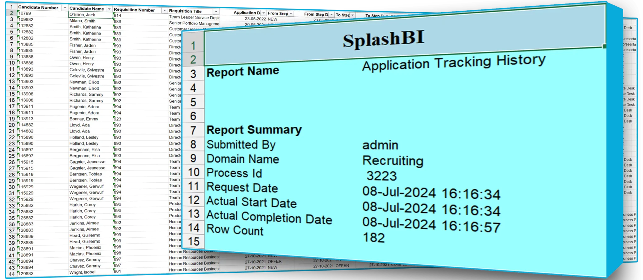 This report displays information about applicants. The information is available in the Job Requisitions/Applications section. A row is displayed for each application, showing details of candidates who applied to one or more requisitions. It includes information such as when the candidate applied to a requisition and all the phases or states the applicant has gone through.